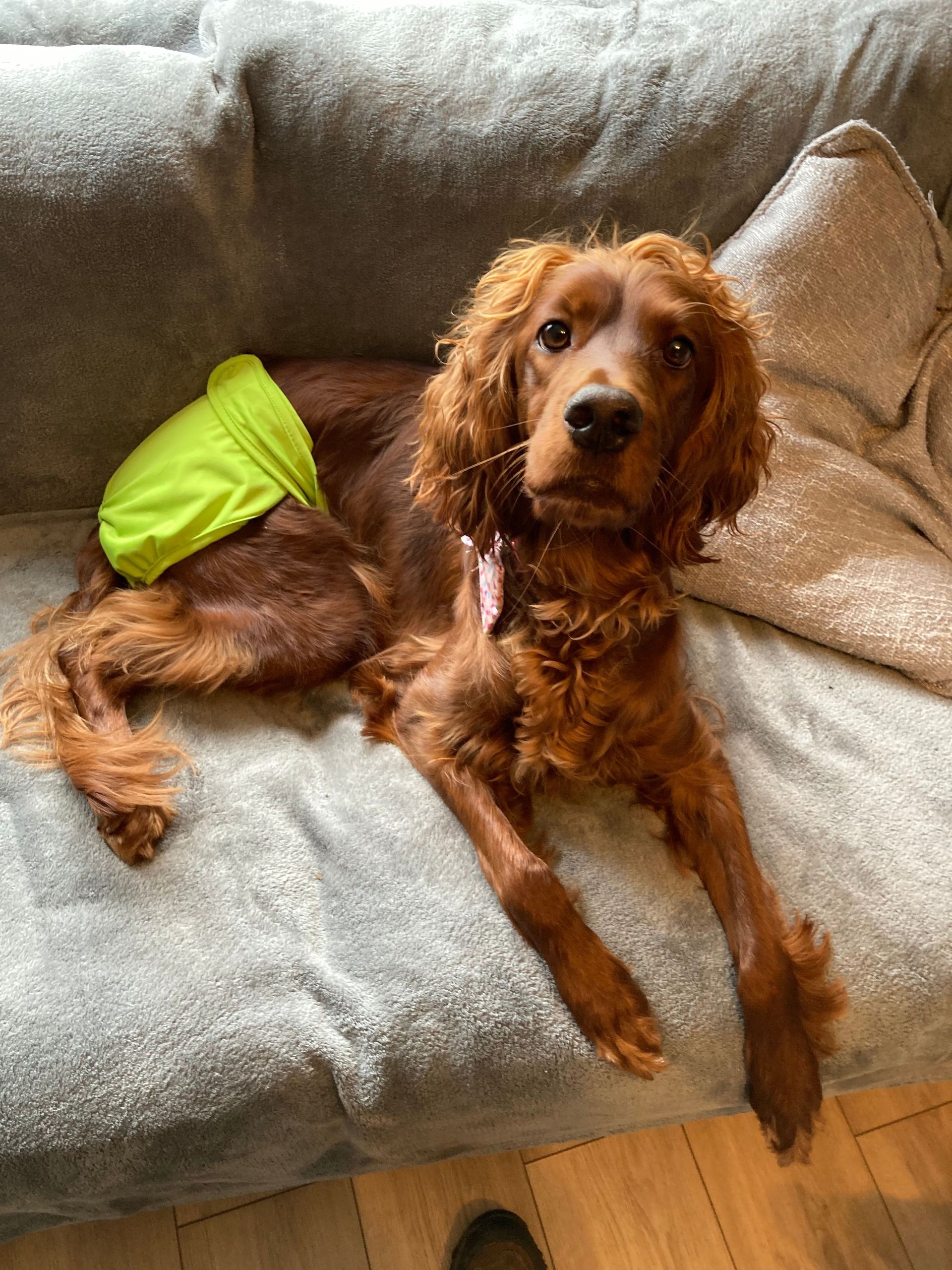 My poor Irish Setter Maggie is in heat as I write this blog and it occurred to me that some of you may be wondering how to care for your dog when the time comes. A heat cycle usually occurs once or twice a year depending on the size of your dog and it will last for around 16-18 days. During this time your dog will be fertile and she can become pregnant and she may experience some physical and emotional changes that require your extra care, love and support. Some of the signs that your dog is in heat A swollen and red vulva. Bleeding or discharge from the vulva. Licking her vulva more than usual to keep the area clean. Weeing more than usual. Changes in appetite. Behaviour changes such as being more friendly, anxious, restless, or clingy. She may also become generally more reactive and intolerant. Attracting male dogs who can smell her pheromones. Tips on how to help your dog during a heat cycle Provide emotional support and attention. Your dog may need more cuddles and reassurance during this time. You can also give her toys and treats to provide her with mental and physical outlets to keep her happy. Keep her on a lead when you take her outside. This will prevent her from running away or getting into trouble with other dogs. You can also change up her walks to avoid busy times and areas where there may be more dogs. Ensure your garden is secure to prevent her from escaping. Ensure you still fulfil your dog's usual exercise requirements. You can still play with her, take her for a lovely walk and do some training exercises to keep her mentally stimulated. Make your home a calm place to rest. Your dog may also need more sleep and relaxation during this time. You can set up a nice, comfortable environment for her with clean blankets, pillows, and toys. You can also use calming music to help her relax. Your dog will bleed or have discharge from her vulva during this time. You can use doggy nappies or pants to avoid stains on your furniture or carpets. You can also put clean towels or blankets on her bedding and favourite spots to absorb her discharge. Make sure to change them frequently and wash them well with a pet-safe washing detergent. Keep an eye on her appetite. Your dog may have changes in appetite during this time. She may eat more or less than usual. Make sure she has plenty of fresh water available at all times since she may become dehydrated and feed her high-quality food that meets her nutritional needs. Having a female dog in heat can be challenging, but with proper care and support, you can make it easier for both of you. Remember that this is a natural process that your dog goes through and that she needs your love and patience during this time. If you need any help with introducing nappies to your dog in preparation for her first heat cycle, please get in touch. If you have any questions or concerns about your dog's health or behaviour during her heat cycle, don't hesitate to contact your vet for advice. I hope this post was helpful for you 🐾
